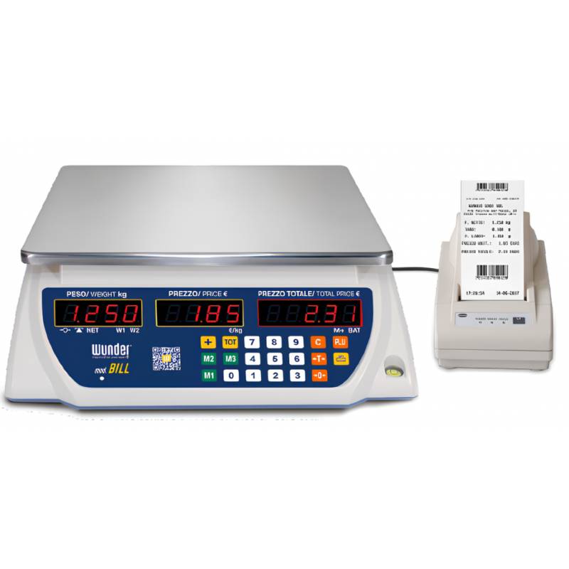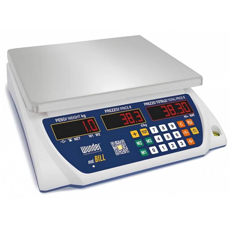 Wunder Bill M+ è una bilancia professionale PESO-PREZZATRICE multirange completa di stampante per atichette. Omologata per il commercio, con display a LED ROSSI visibili in tutte le condizioni di luce ambientale. Struttura in ABS con tastiera a membrana meccanica. Tasti sagomati. 3 Grandi display a LED ROSSI 30mm 5 cifre su lato principale. Fornita di serie con un Secondo display sul retro della bilancia a LED ROSSI 20mm ben leggibili su lato cliente. Memoria per 102 articoli PLU di cui 99 diretti; Introduzione prezzo unitario; Tara.
